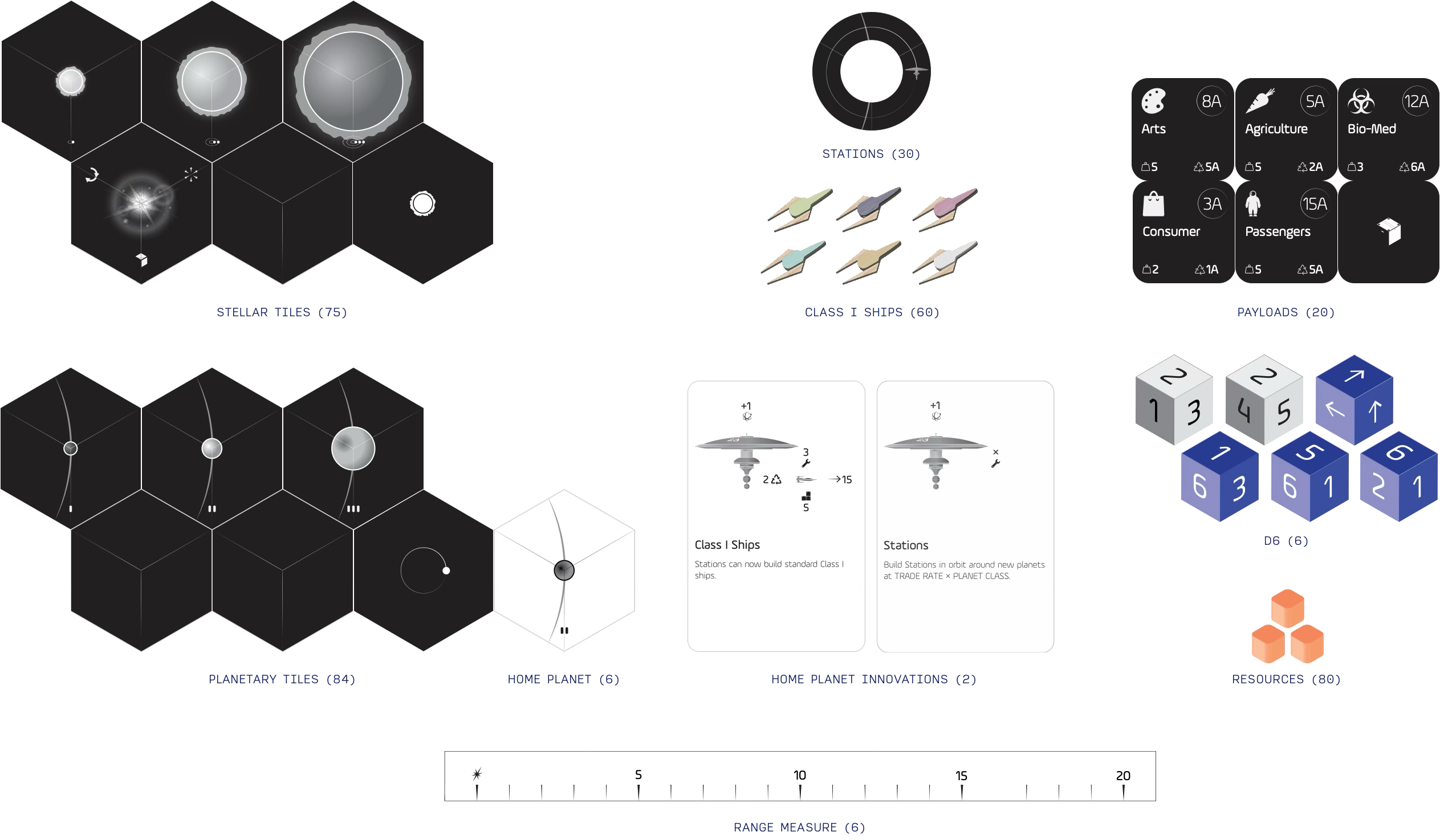 Star Carriers is a generative mid-weight strategy board game in which players venture to become the best interstellar carrier in the galaxy. Through exploration, innovation, and enterprise, players expand their routes between star systems to foster travel and trade. The game offers scientific, social, and economic challenges we might face as a commercial space-faring civilization.